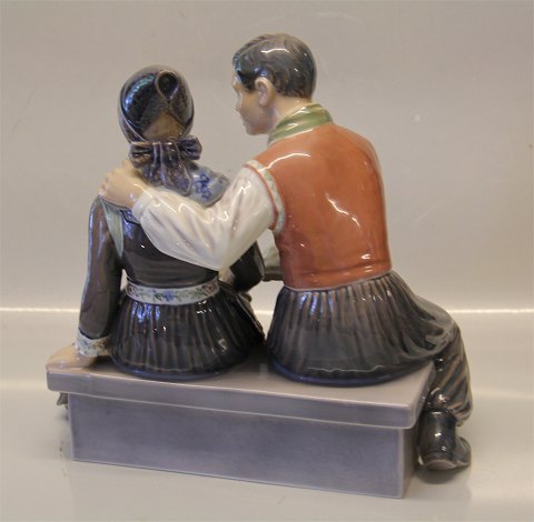 Beskrivelse: Dahl Jensen. 1220 Frieri 28 cm Frierscene Amager-dragter Mærket med kongelig krone og DJ Copenhagen i hel og fin stand. 1. sortering