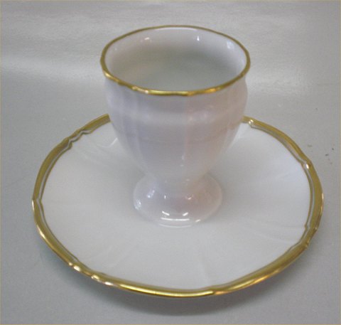 Beskrivelse: Bing & Grøndahl Offenbach 056 Æggebæger på fod 6 cm (696) Hvidt kantet porcelæn med bred guldkant.Bing & Groendahl I hel og fin stand