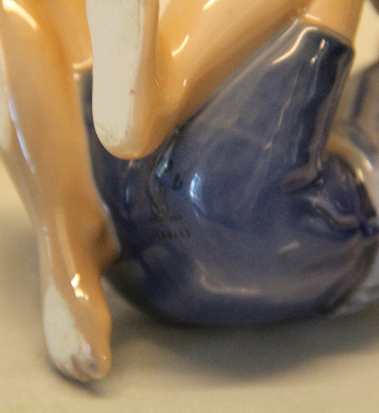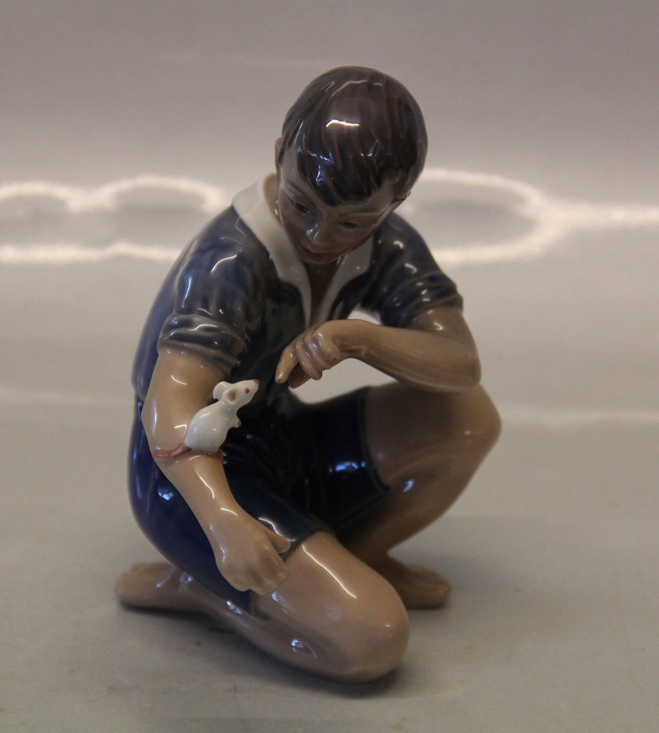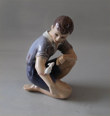 Beskrivelse: Dahl Jensen 1270 Dreng med mus 13 cm (DJ). Mærket med kongelig krone og DJ Copenhagen 1. sortering i hel og fin stand.