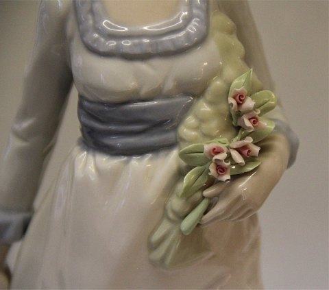 Beskrivelse: Stor Spansk figur Nadal: Pige med kyse og blomster 34 cm I stil med Lladro, Dao, Nao fra Spanien Mærket Nadal Handcrafted Spanish Porcelain
