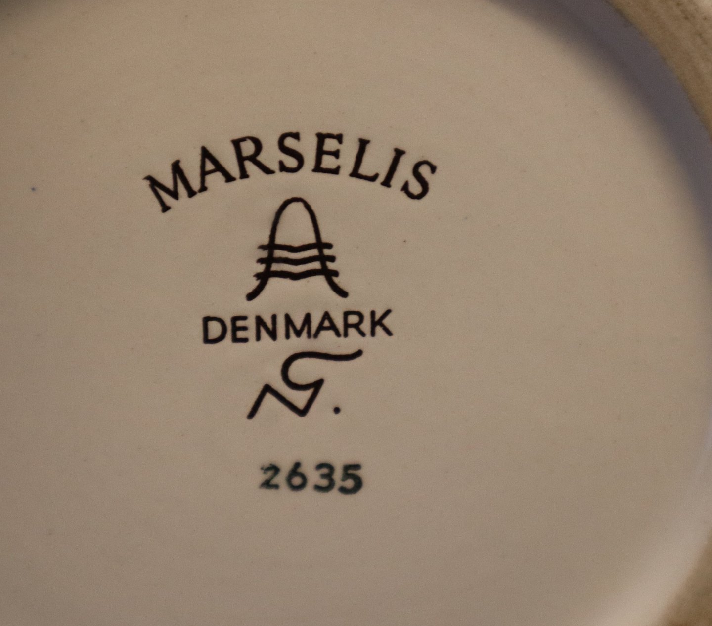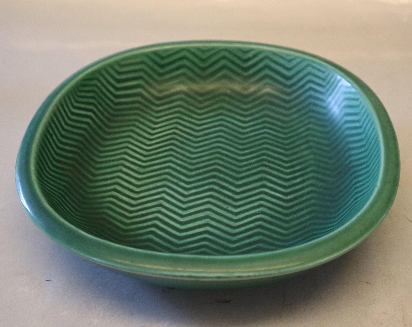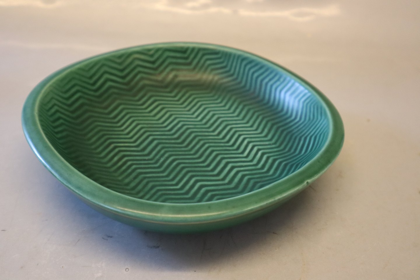 2635 Marselis Lyse Grøn skål, rund-elipseformet med zig-zag mønster Nils Thorson, 1953 Aluminia kunstfajance
