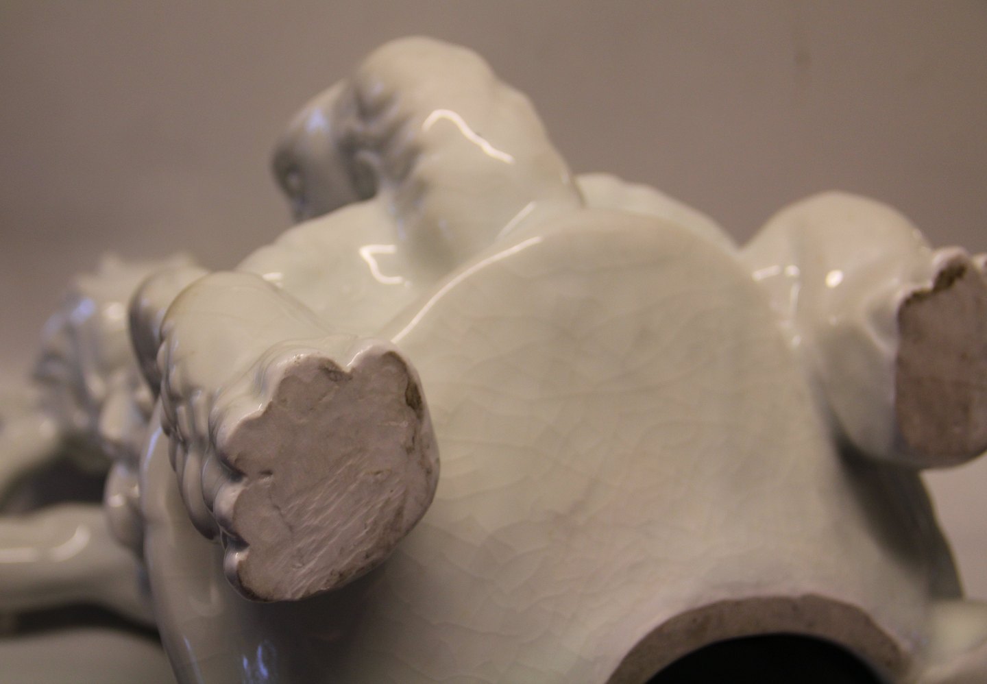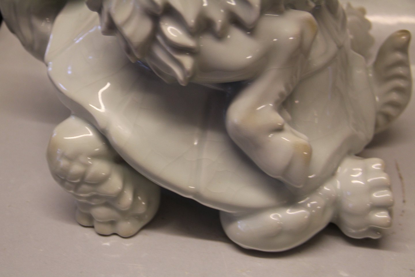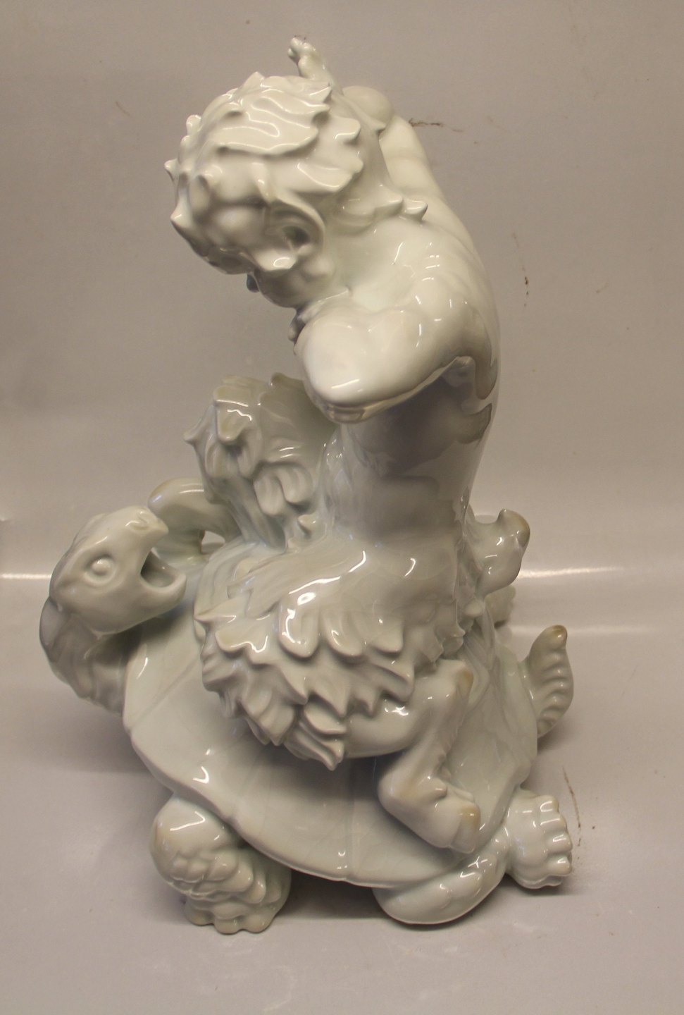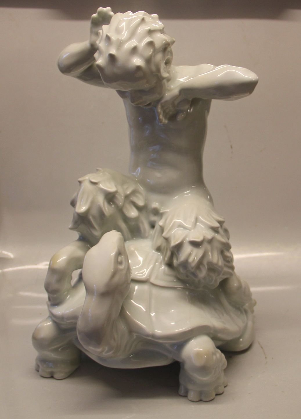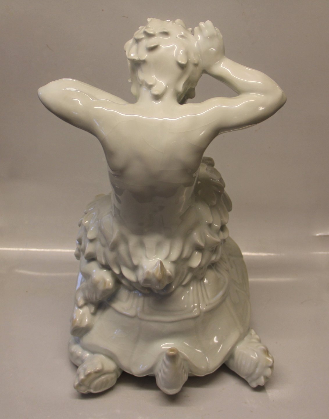 Beskrivelse: 3082 Faun med skildpadde KK 1929 46,5 x 32 cm Royal Copenhagen stentøj Hvid Craquelé I fin stand