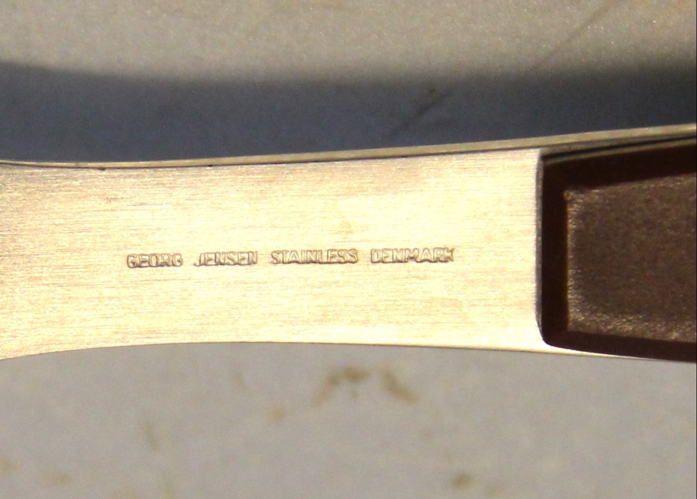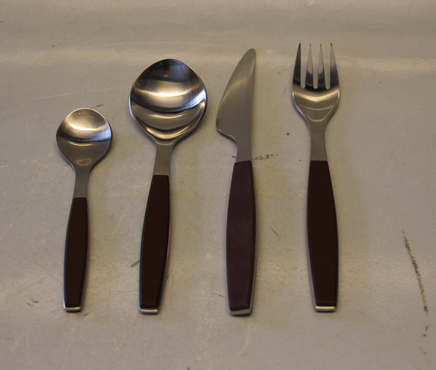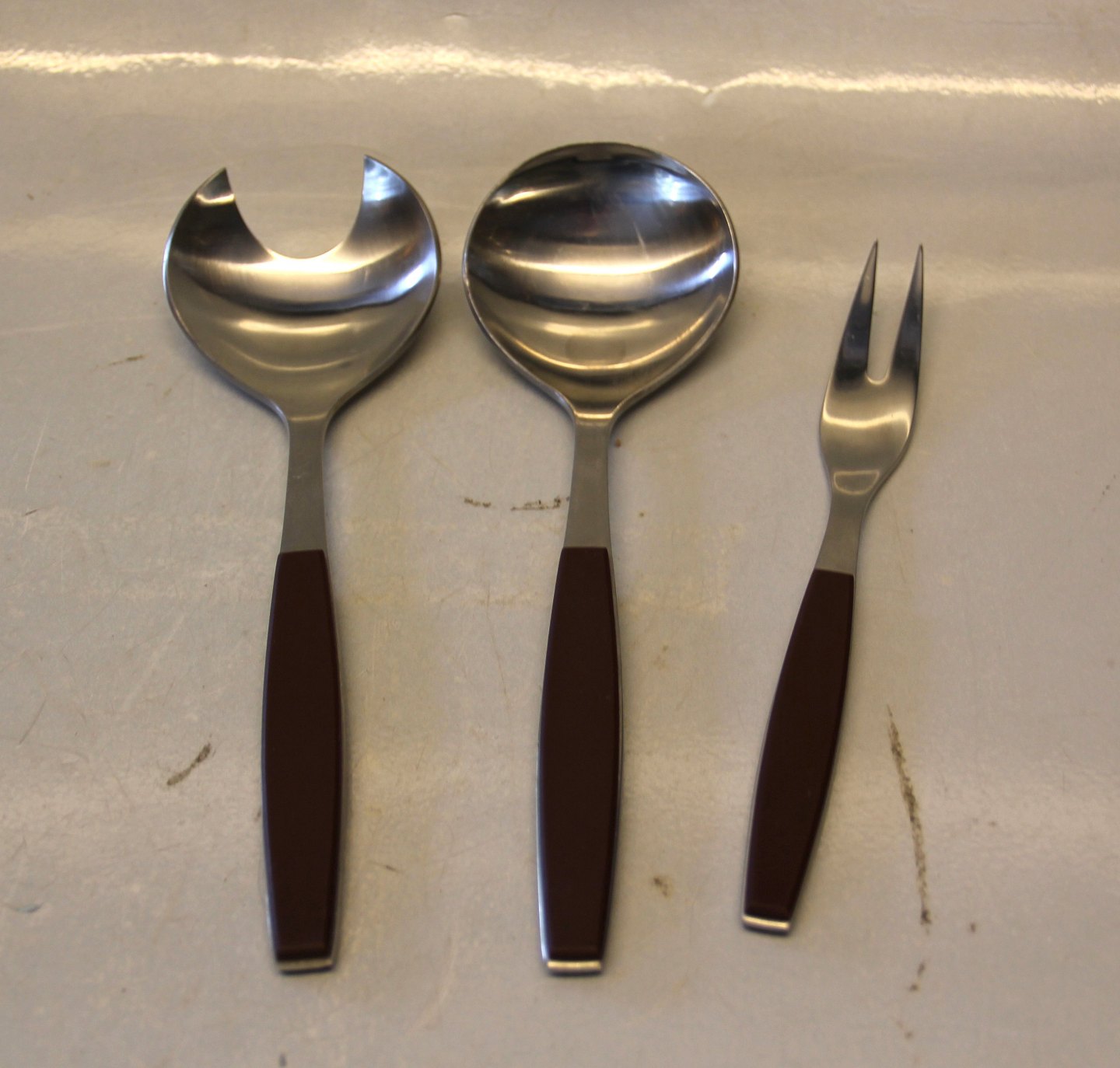 : Henning Koppel. Strata bestik af rustfrit stål og brun plast Fremstillet hos Georg Jensen: