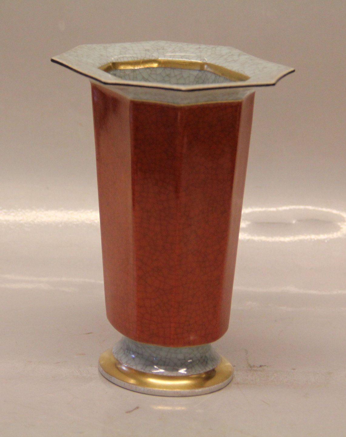 Kongelig Dansk Craquelé, Craquele 212-2504 Kgl. Vase rød, grå og guld 17 x 13.5 ottekantet