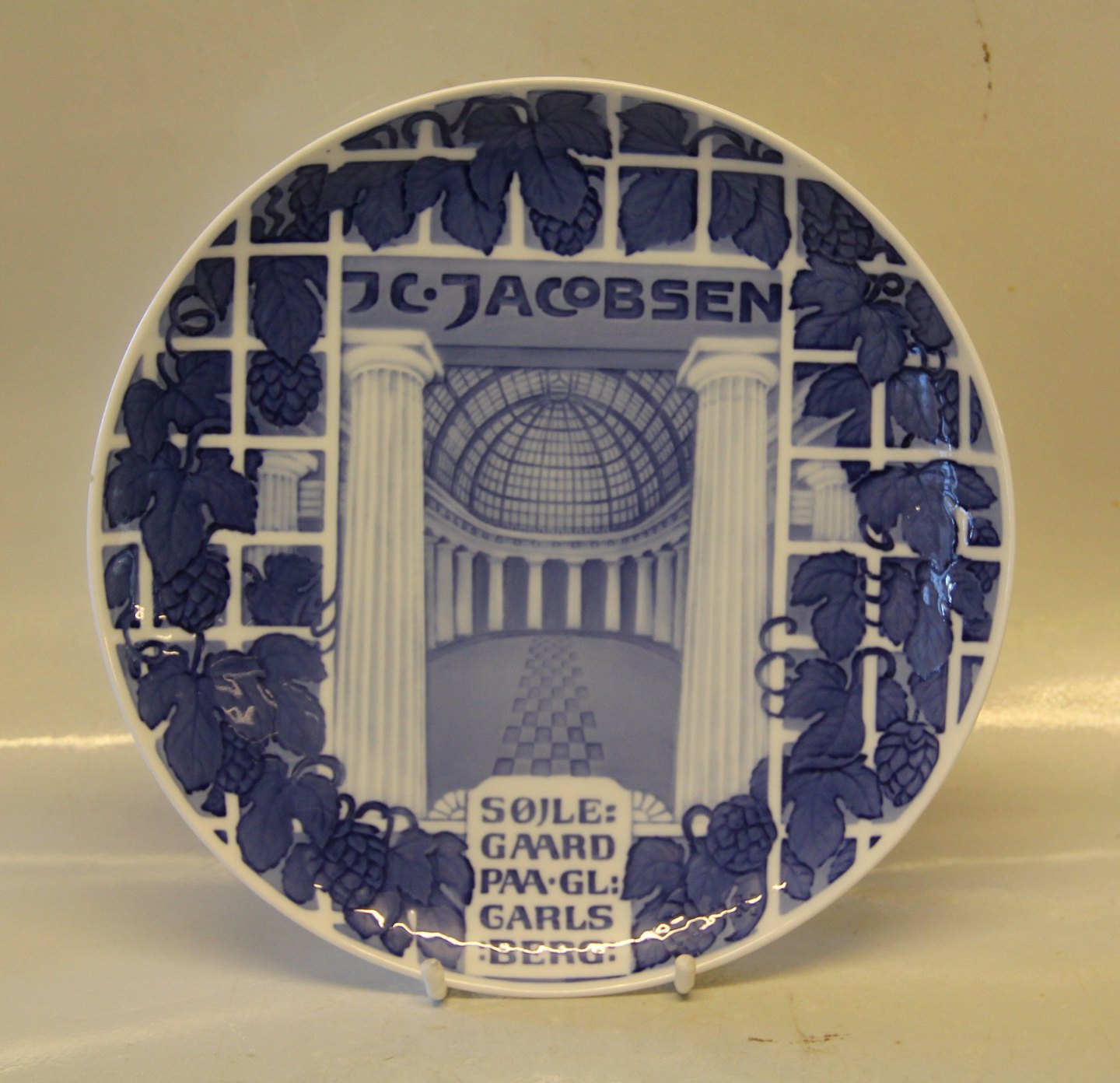 Søjlegården på Gl. Carlsberg. Indskrift: J. C. JACOBSEN, SØJLEGAARD PAA GL.CARLSBERG. .161 eks. 25 cm. Royal Copenhagen mindeplatter også kaldet lejlighedsplatter fremstillet til særlige lejligheder eller på bestilling. Dem kongelige porcelænsfabrik har fremstillet over 500 forskellige.