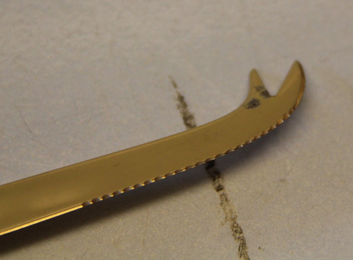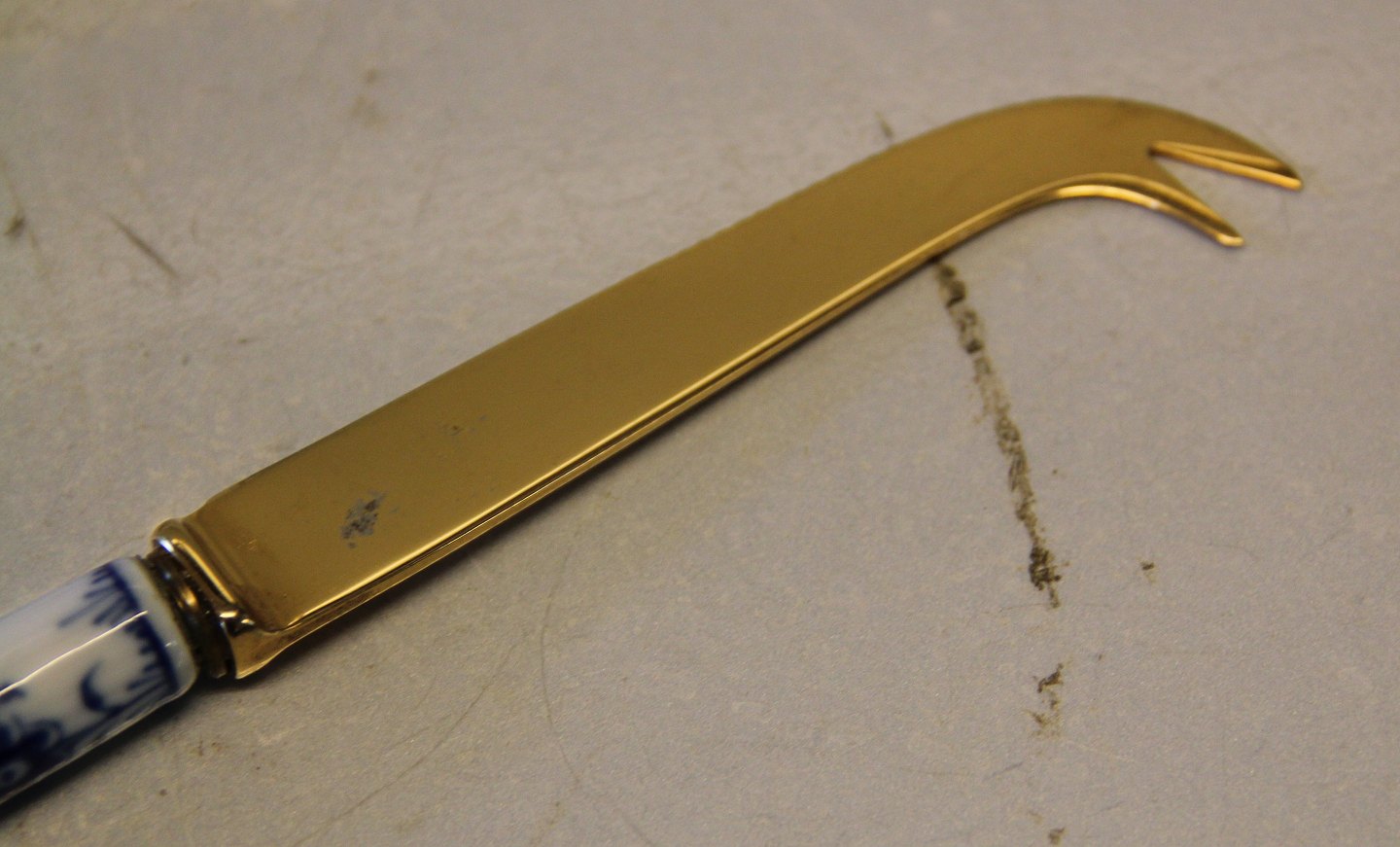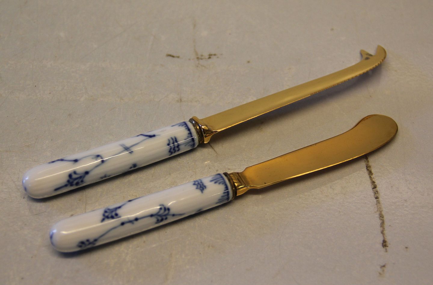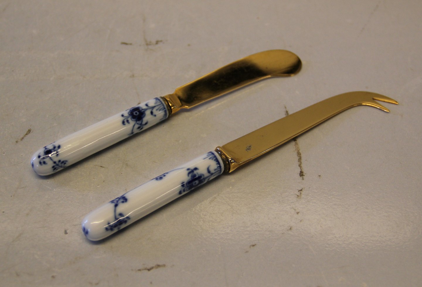 Kongelig Dansk Porcelæn Musselmalet par smørkniv 16.5 cm og ostekniv 18.5 cm forgyldt stlåblad