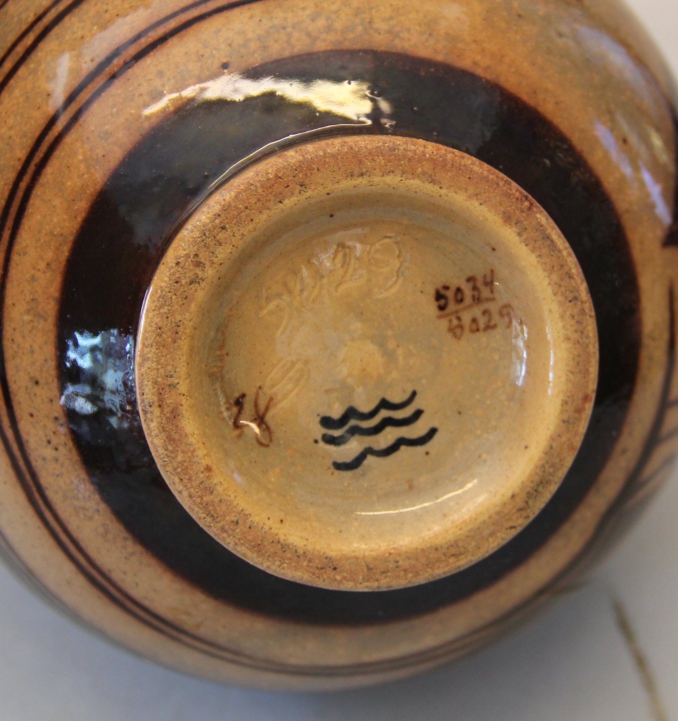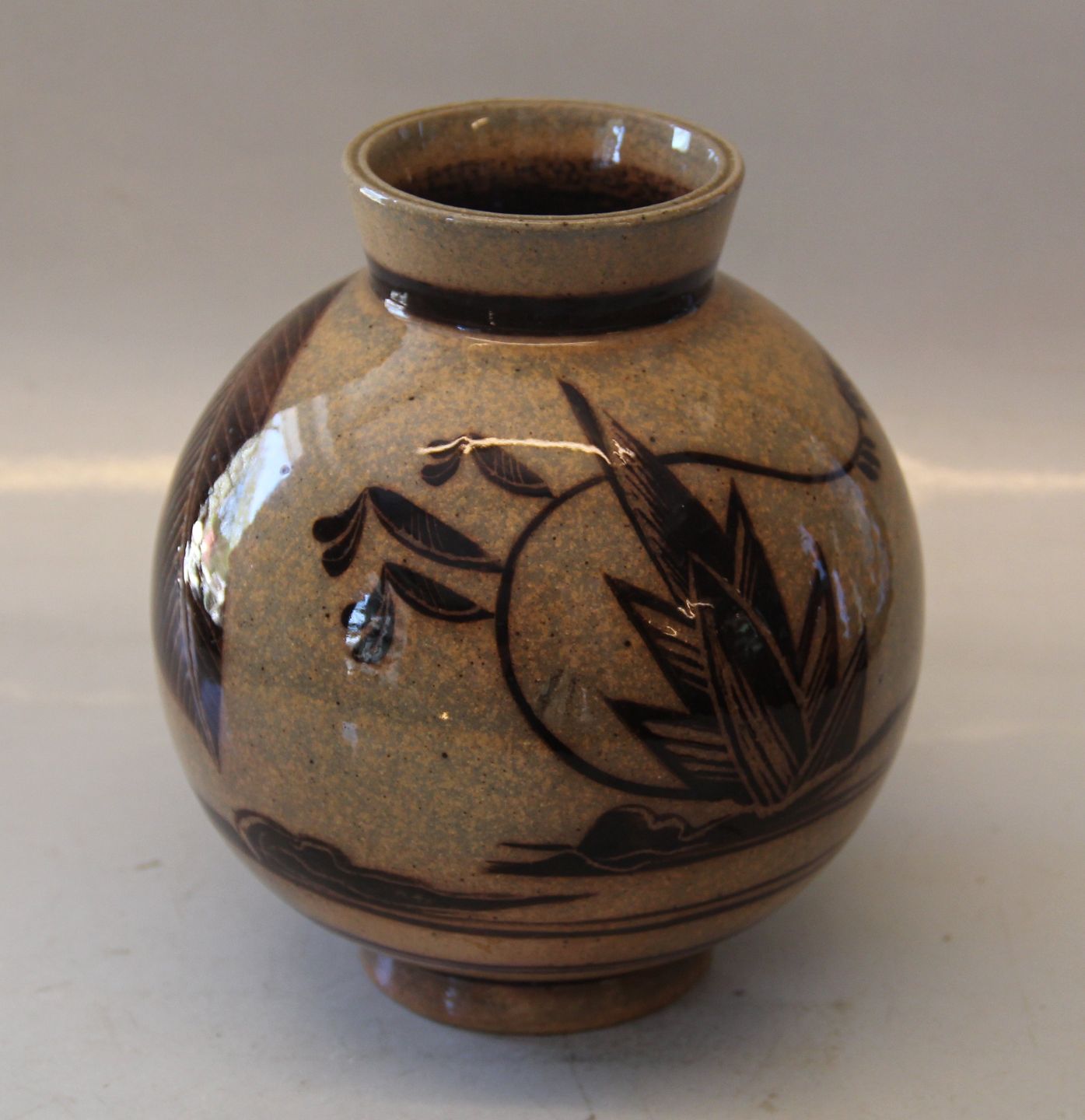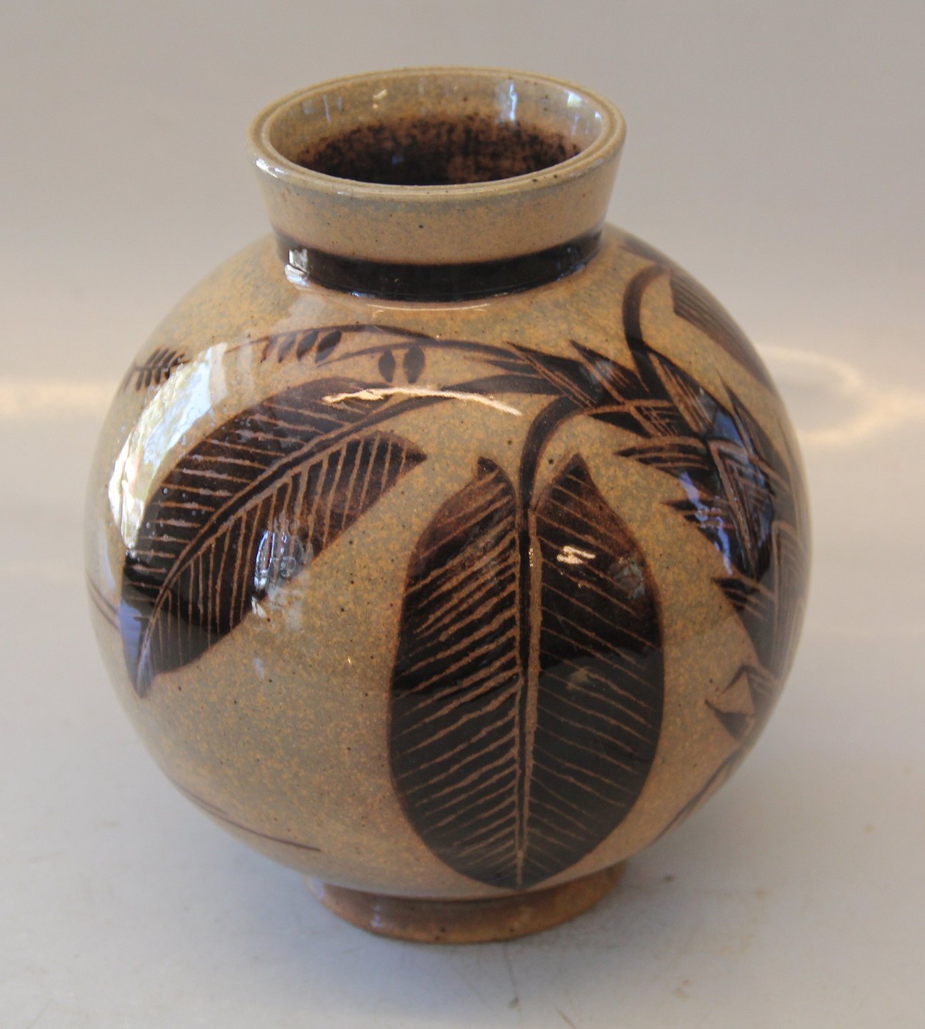 Beskrivelse: 5034-5029 Aluminia Jungleserien 1932 Kuglevase 17 cm "Spidse Palmeblade på Øe" Nils Thorsson Royal Copenhagen Aluminia stentøj I fin og hel stand
