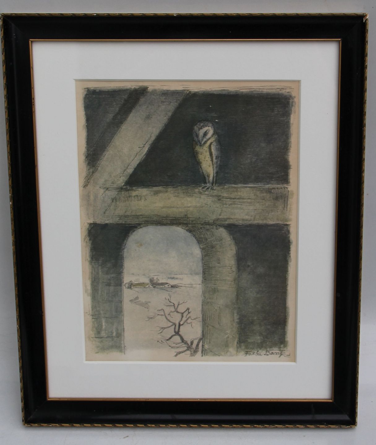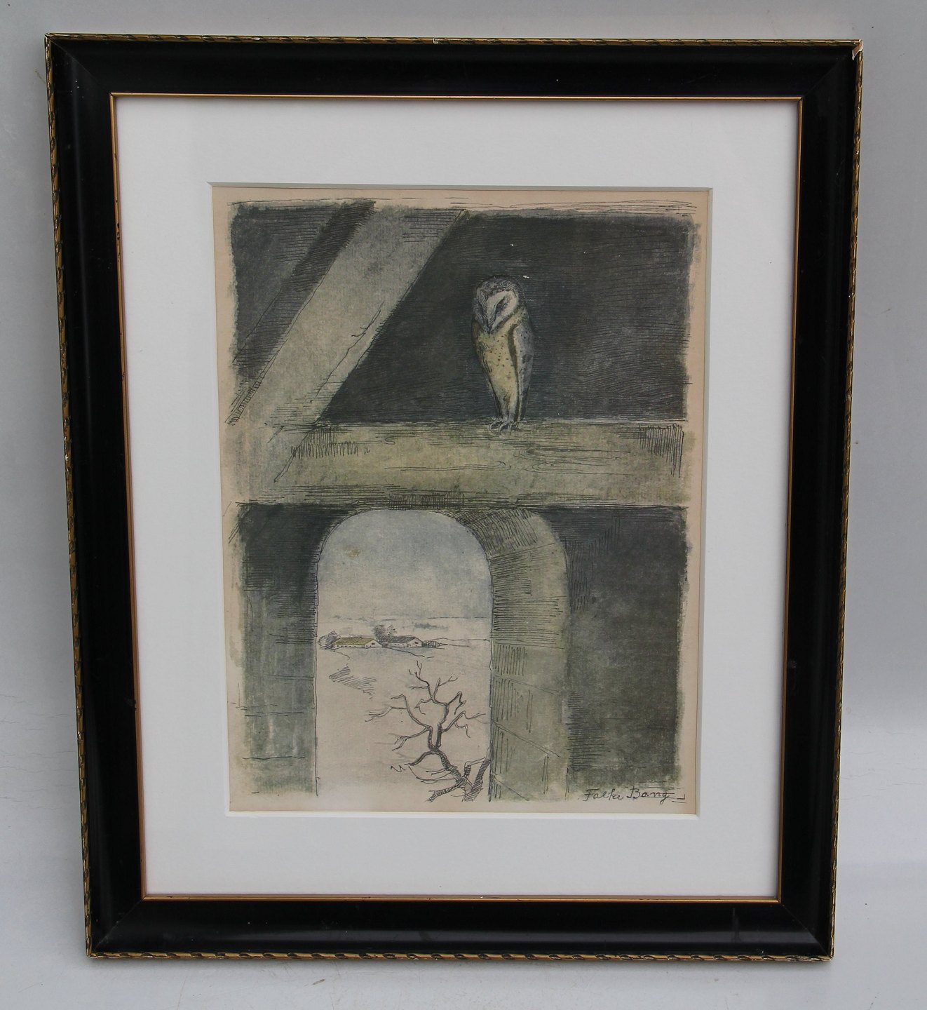 : Falke Bang (1912-1998) Danmark Slørugle 39 x 32.3 cm inklusiv ramme