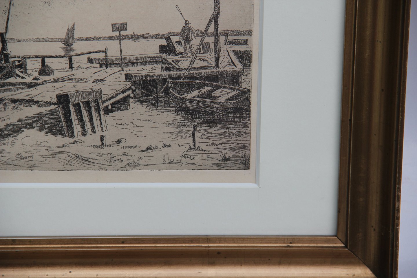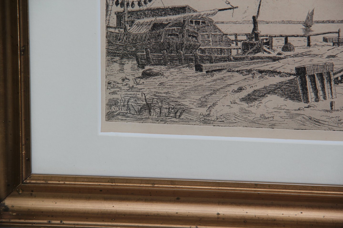 Radering Havnemotiv 29.5 x 37 cm inklusiv Guldramme
