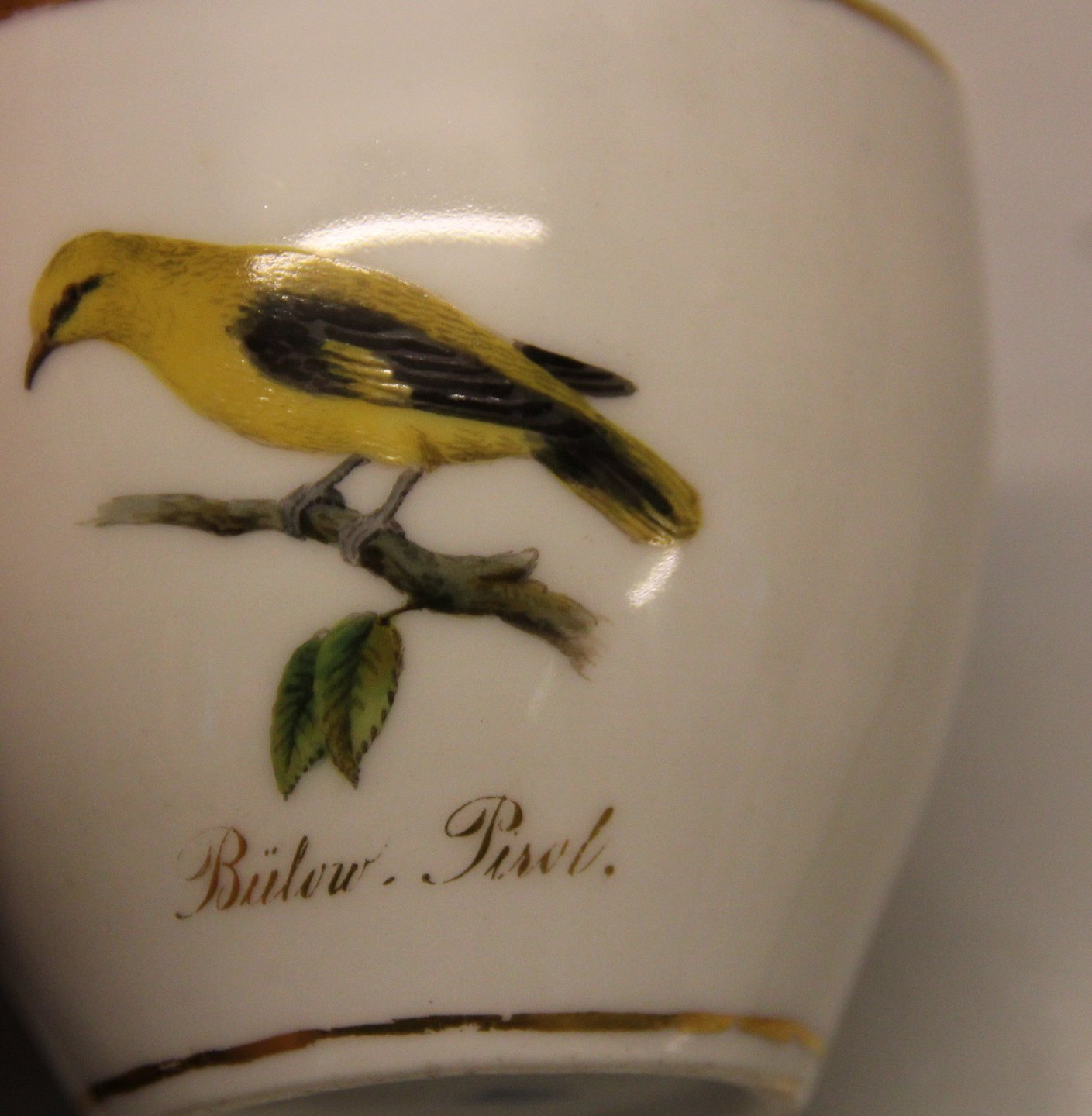 Kongelig Dansk Antik højhankskop med fugl : Bülow Pirol 9 x 9.50 cm & underkop 17 cm ca 1790-1850