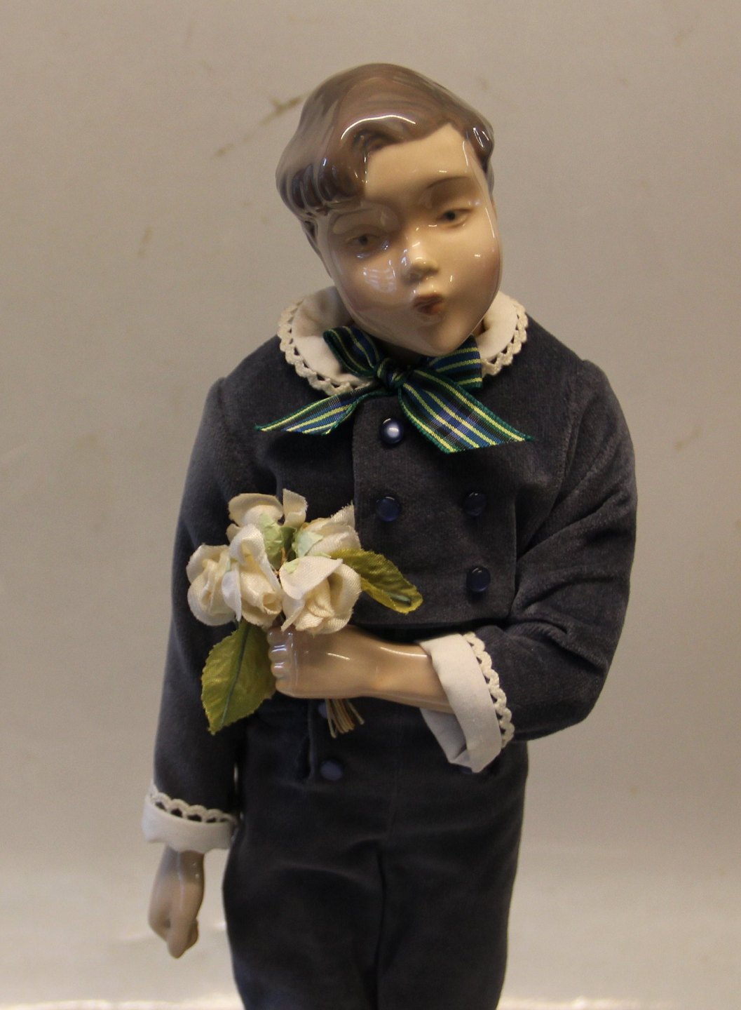 Bing & Grøndahl B&G 1986 Årsdukke "Hans" 38 cm m stativ og træstand På frierfødder dreng med blomster