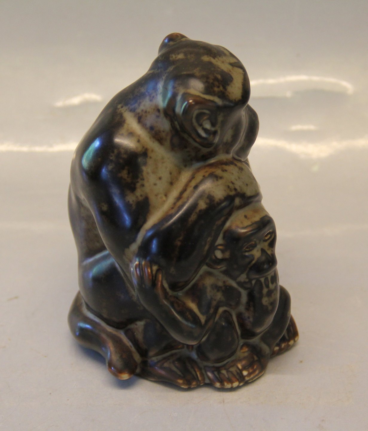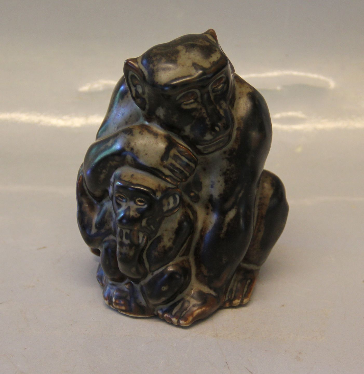 Beskrivelse: 20199 Kgl. Abe med unge 12 x 10 cm, Knud Kyhn, april 1929 Royal Copenhagen stentøj I fin og hel stand