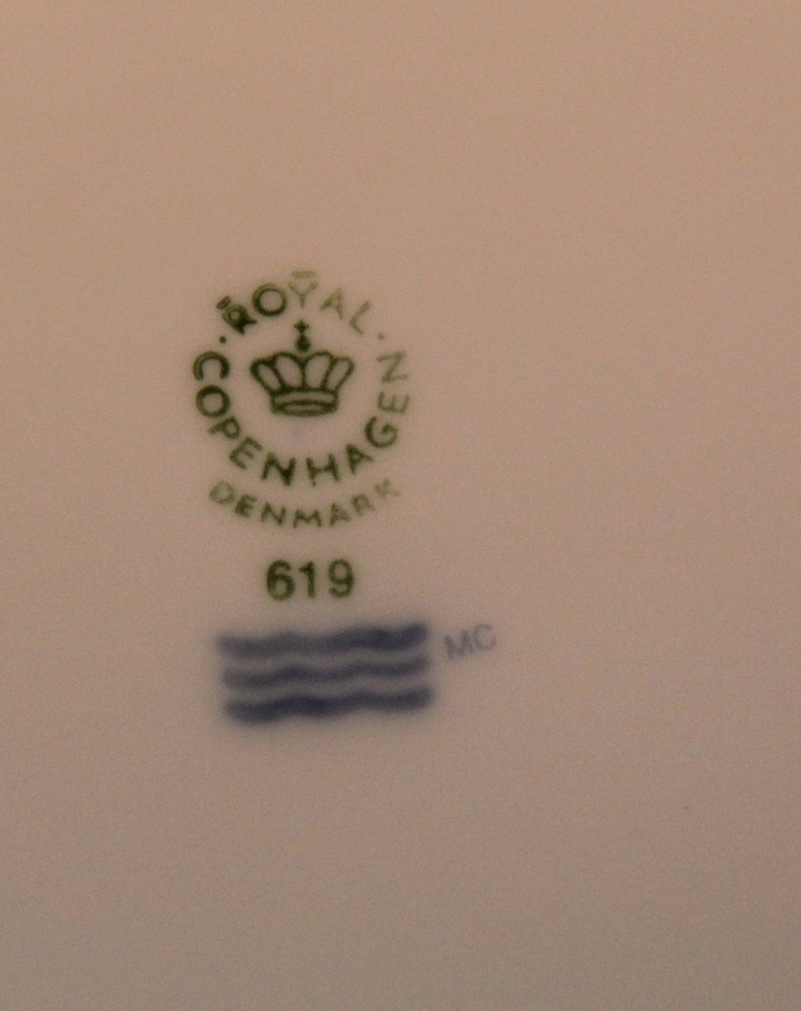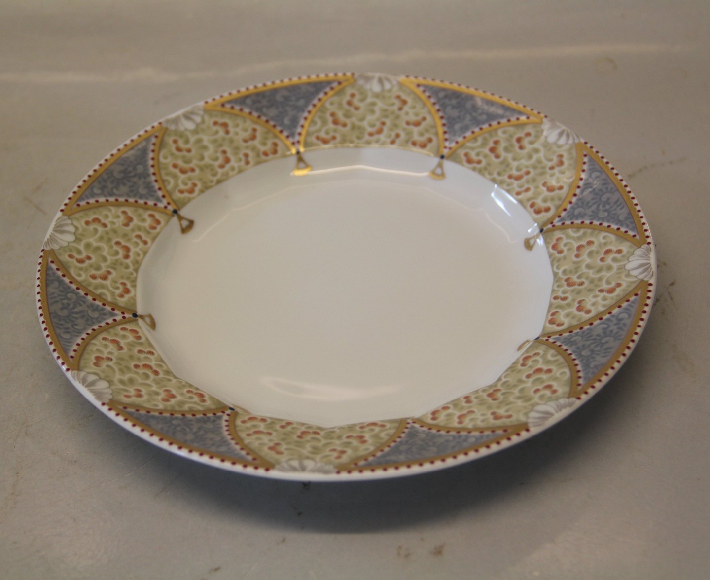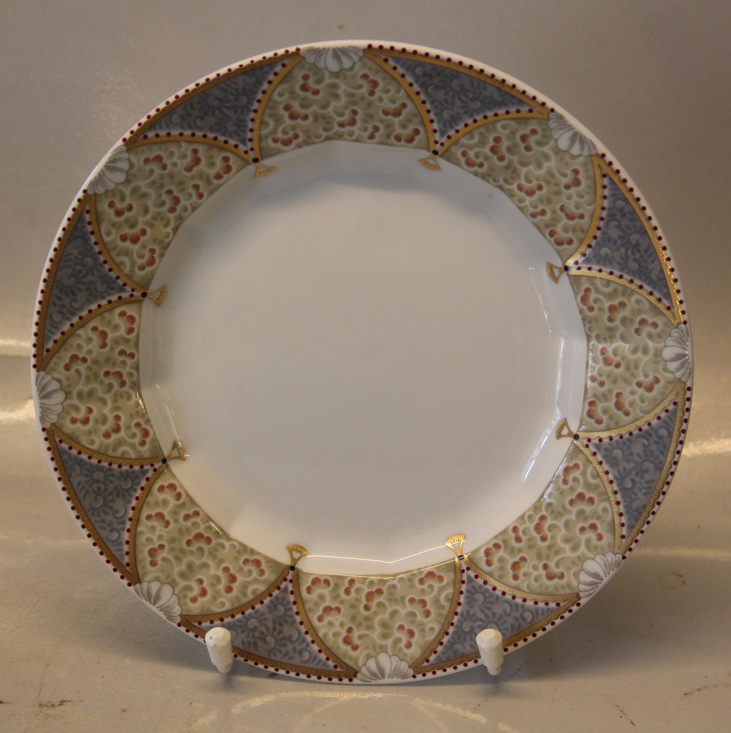619 Sidetallerkener 19,5 cm (8514) Royal Copenhagen Fairytale. Inspireret af Gerhard Hennings figurer af samme navn. Et kompleks flerfarvet transfer mønster på den kantede form som Blå Blomst Kantet. Design Finn Næss-Schmidt og Jørgen Nielsen. De grå dele har nummer 1201, terrakotta 1202 og serveringsdele med lidt af hvert 1203.