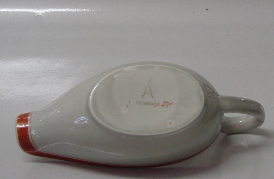 Smørkande - sauce ca 8 x 18 cm Alluminia Tureby Stel Dekoration 254 Design Nils Thorsson 1934 Rødt bånd og guld Håndmalet på Viktoria III Turreby