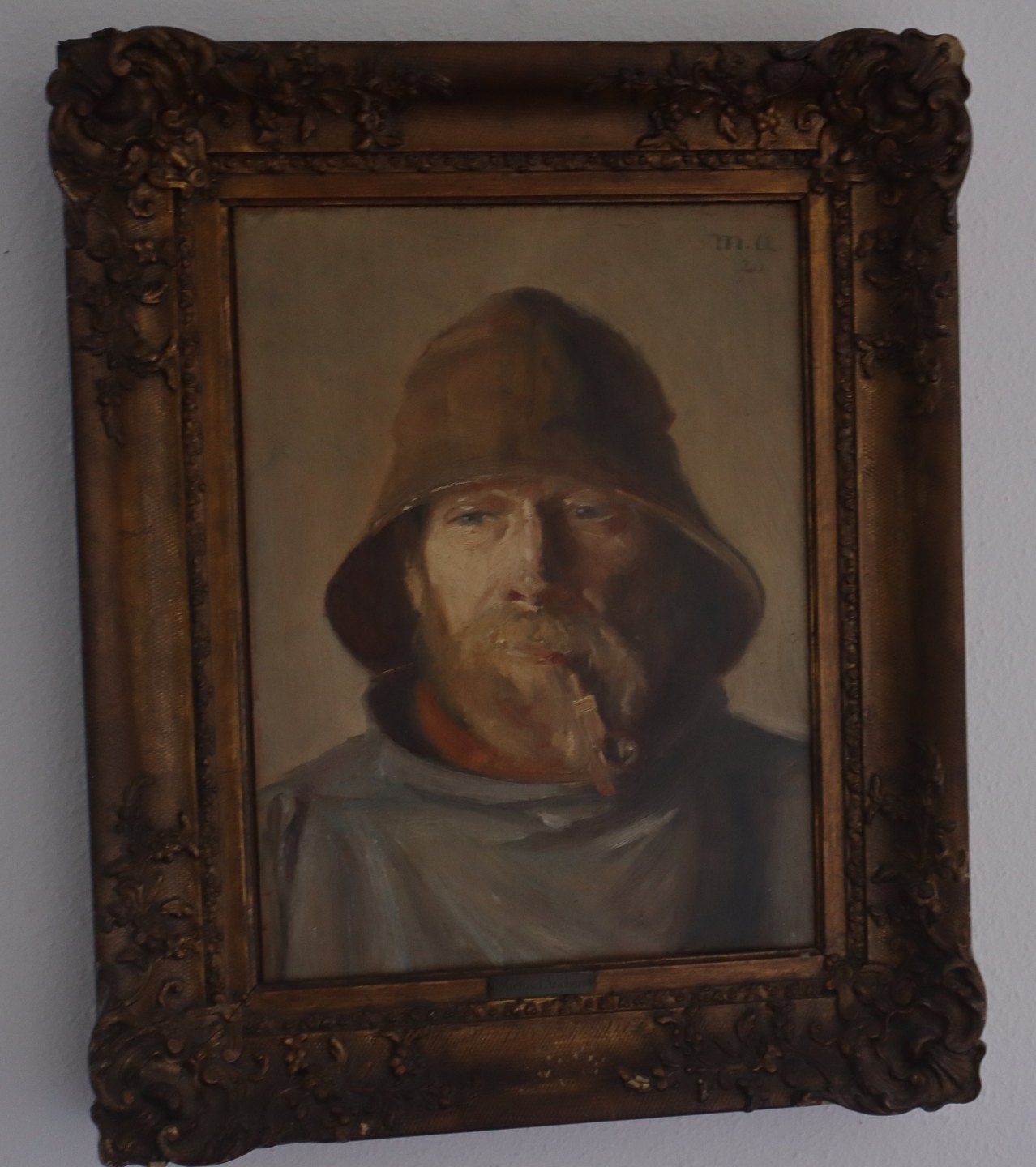 Michael Ancher 1920: Olie på plade. Fisker med pibe. ca 33 x 34 cm Signeret MA 20