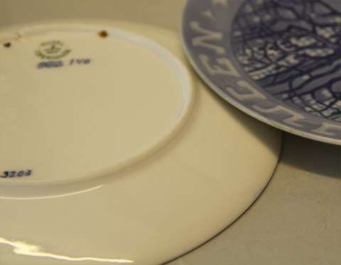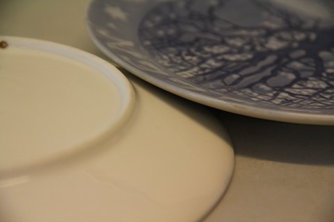 Beskrivelse: Royal Copenhagen Juleplatte 1914 Spurve i træ foran oplyst vindue i Helligåndskirken i København. Design: Arthur Boesen
