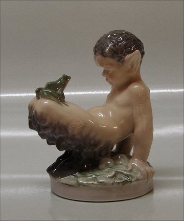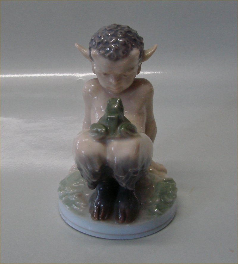 Beskrivelse: Kgl. figur fra Royal Copenhagen 1713 Faun eller trold med frø 12 cm. 1. sort I hel og fin stand Chr. Thomsen