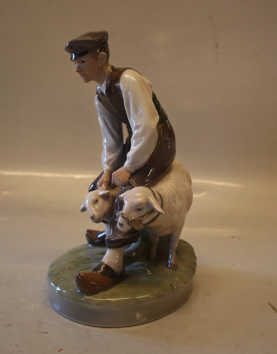 Beskrivelse: Kgl. figur fra Royal Copenhagen 0627 Bonde med 2 får Design Chr. Thomsen. 1905 2. sortering I hel og fin stand 1. sortering haves også Kr 1600