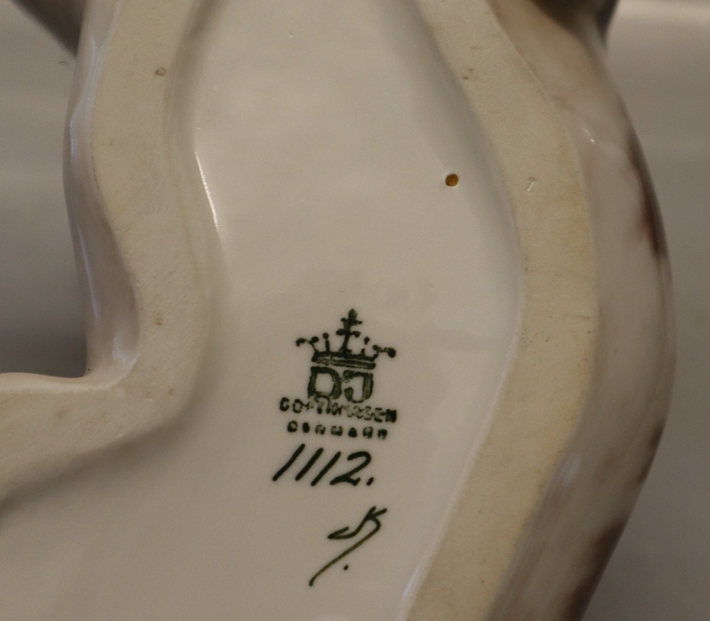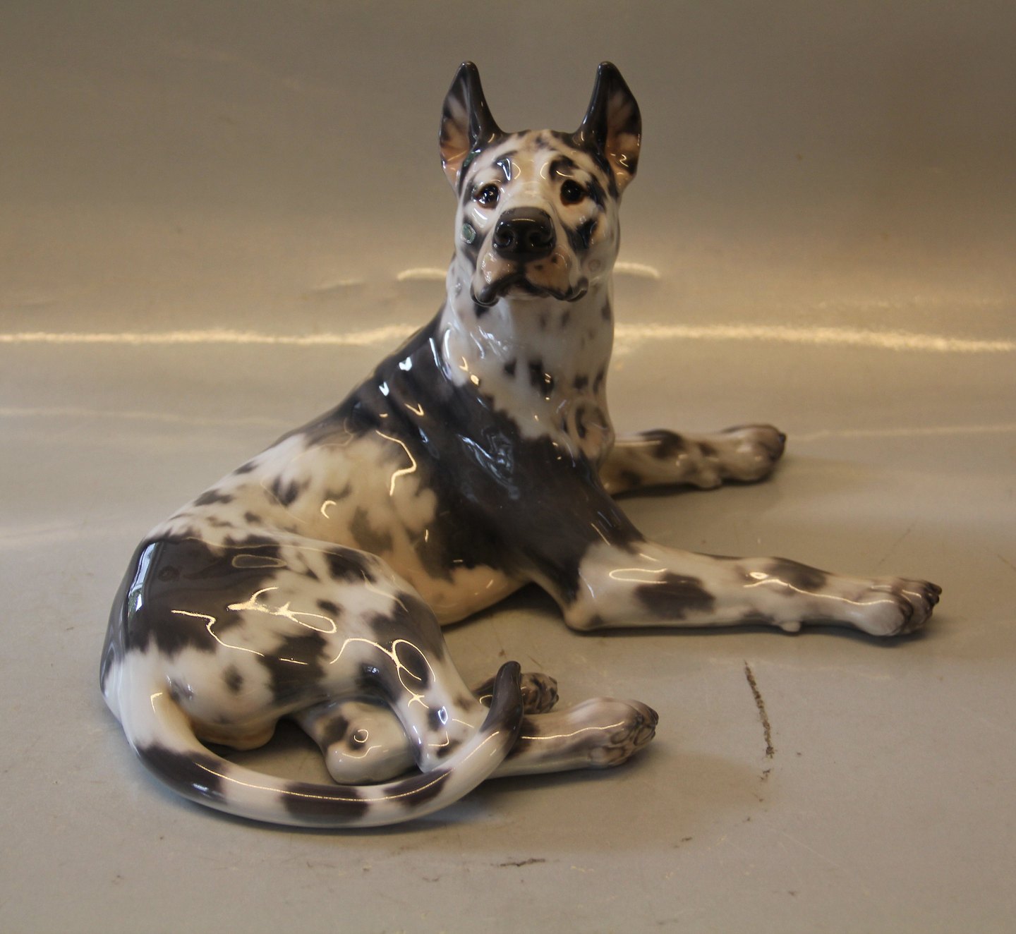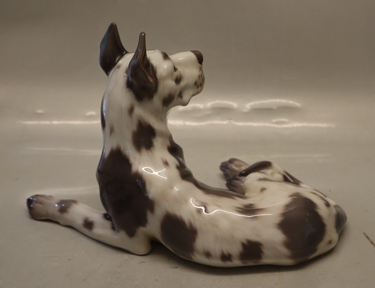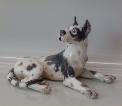 Beskrivelse: Dahl Jensen hund. 1112 Great Dane, liggende 18 x 29 cm Mærket med kongelig krone og DJ Copenhagen i hel og fin stand