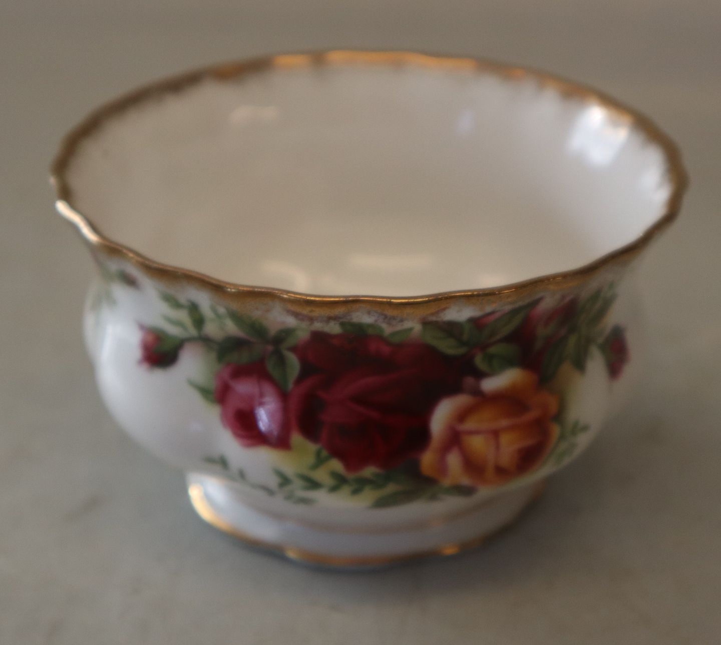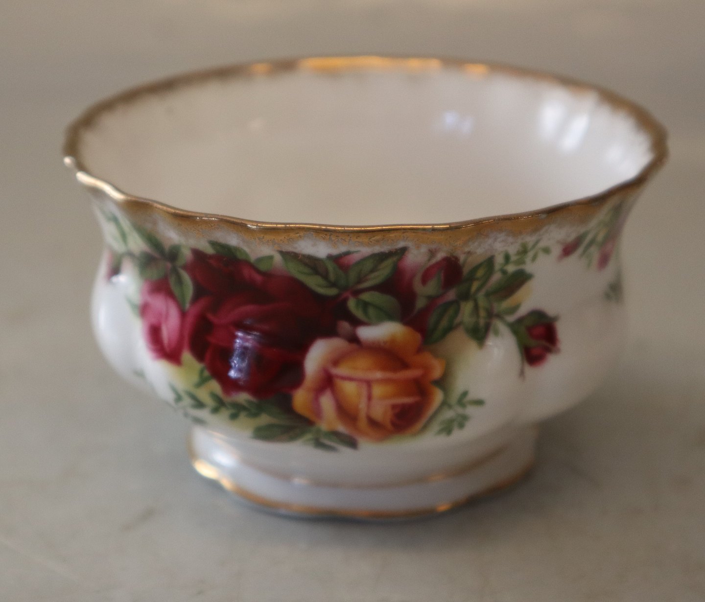 Sukkerskål ca 6 x 9 cm Landsbyrose Royal Albert Old Country Roses Bone China England. I God brugt stand