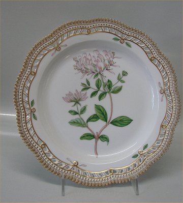 Kongelig Dansk Porcelæn Flora Danica 20-3574 Lonicera Perielymenum L Rundt fad med gennemskåret bort 28,25 cm