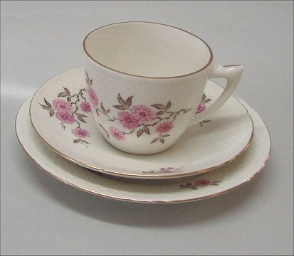 Beskrivelse: Volmer Bing & Grøndahl Creme porcelæn, japansk æbleblomst og guldkant, form 356. På lager: