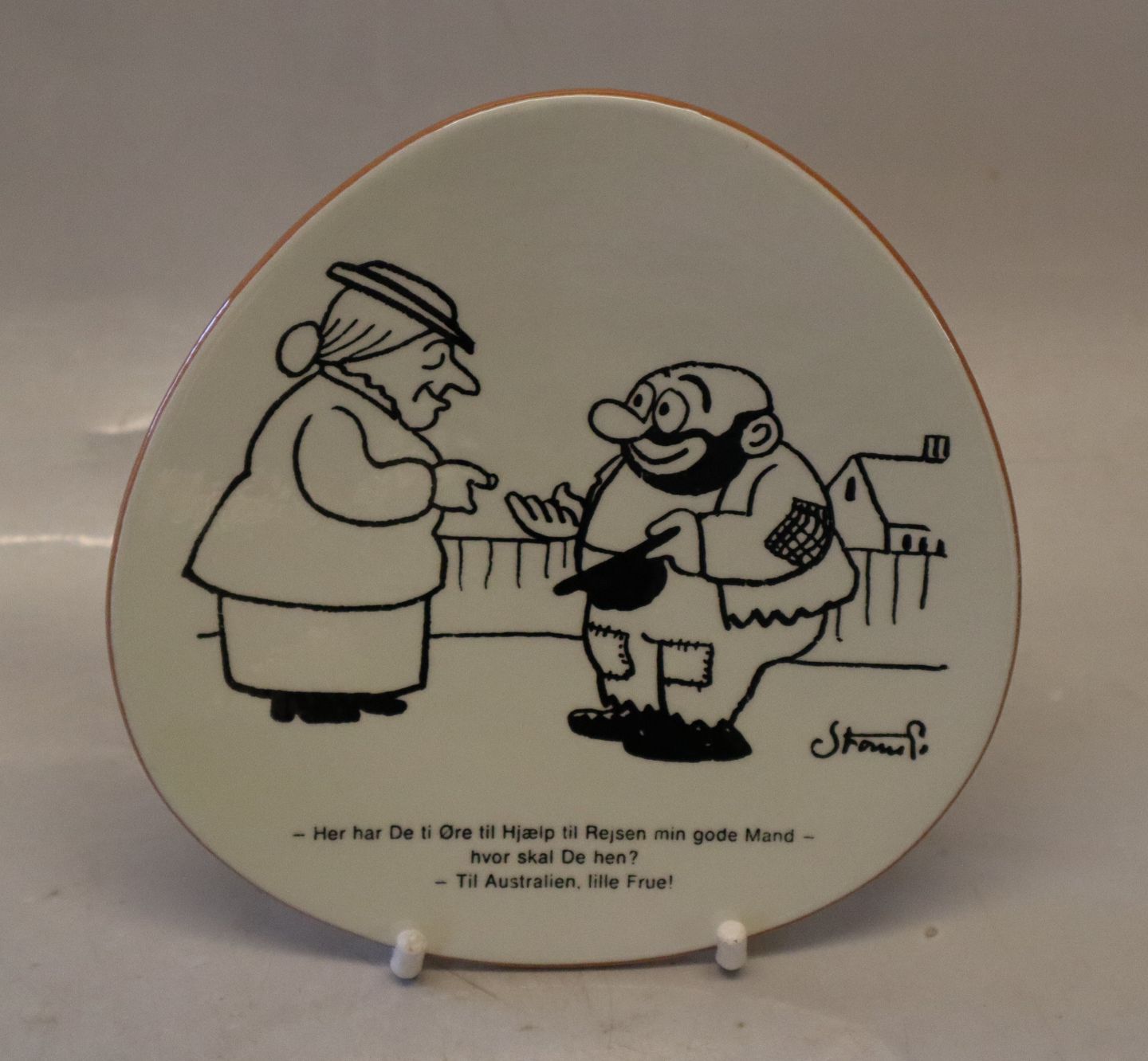 Beskrivelse: Knapstrup trekantet platte ca 16 cm Storm P: Her har de ti øre til Rejsen min gode Mand - hvor skal de hen? - Til Australien, lille Frue