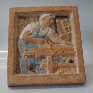 Beskrivelse: Bing Grondahl stentøj Tømrer B&G 2121 Snedker Relief Karl Otto Johansen 25 x 22 cm I fin og hel stand Bing & Groendahl Tømmeren