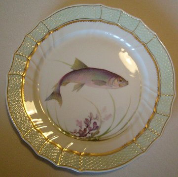 Beskrivelse: Royal Copenhagene Fisketallerken med grøn kant. Malet af samme malere som malede Flora Danica Fiskestel. 919/1710. Maler er LX.