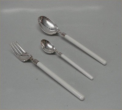 : Dansk Sølv Hans Hansen Amalie Sterlingsølv med hvid emalje. Som nye i originale bokse.