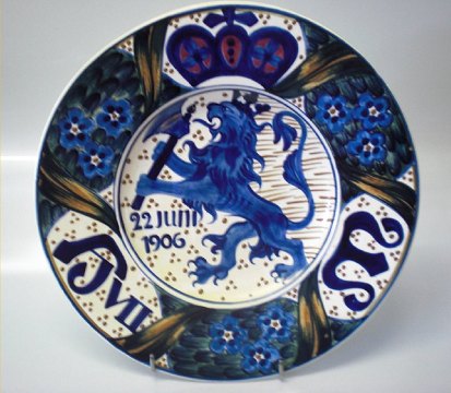 1906 Den kongelige porcelænsfabriks Fajance fra Aluminia 481-352 Aluminia Platte Dronning Maud og Kong Haakons d. 7.s Kronningsplatte 1906 25 cm