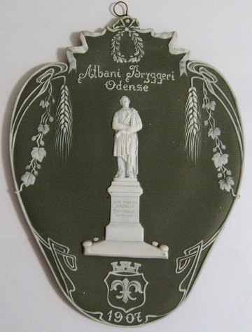 Beskrivelse: Albani Bryggeri Platte fra 1907. Indskription: Albani Bryggeri Odense, Hans Christian Andersen Født i Odense 2. April 1905.
