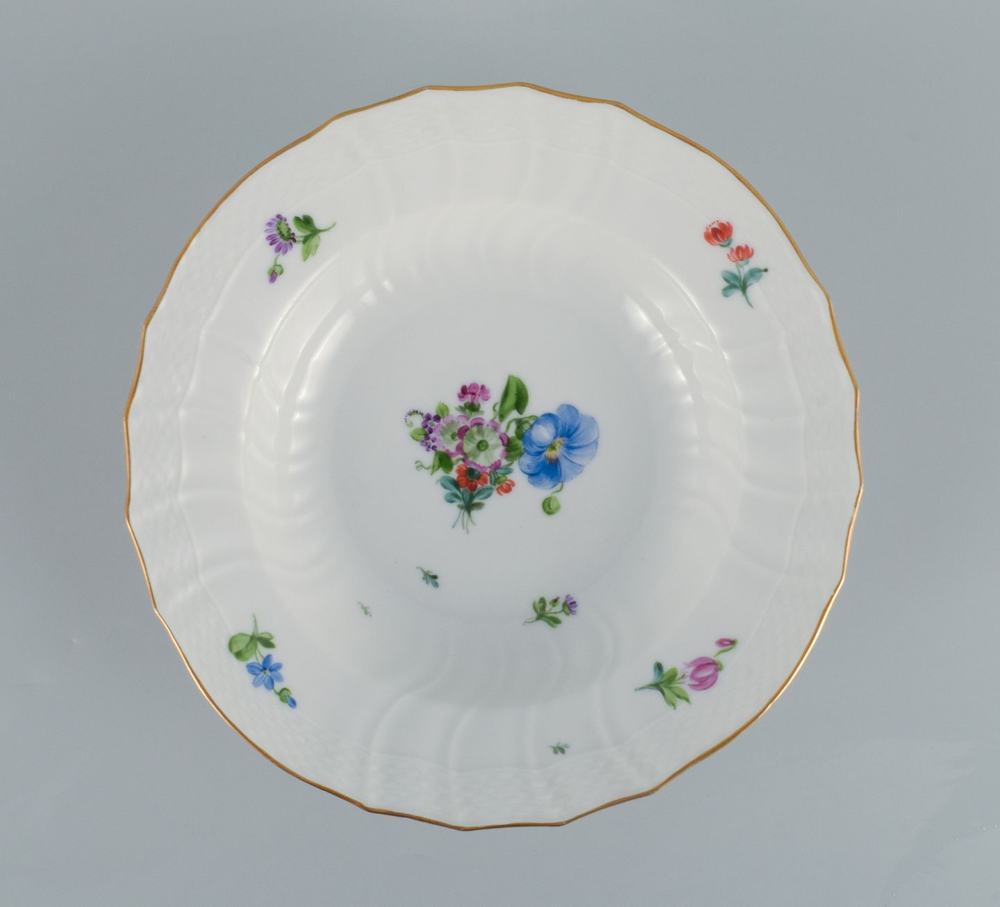 Royal Copenhagen Saxon Flower. Six deep plates in hand-painted porcelain with flowers and gold decoration.
