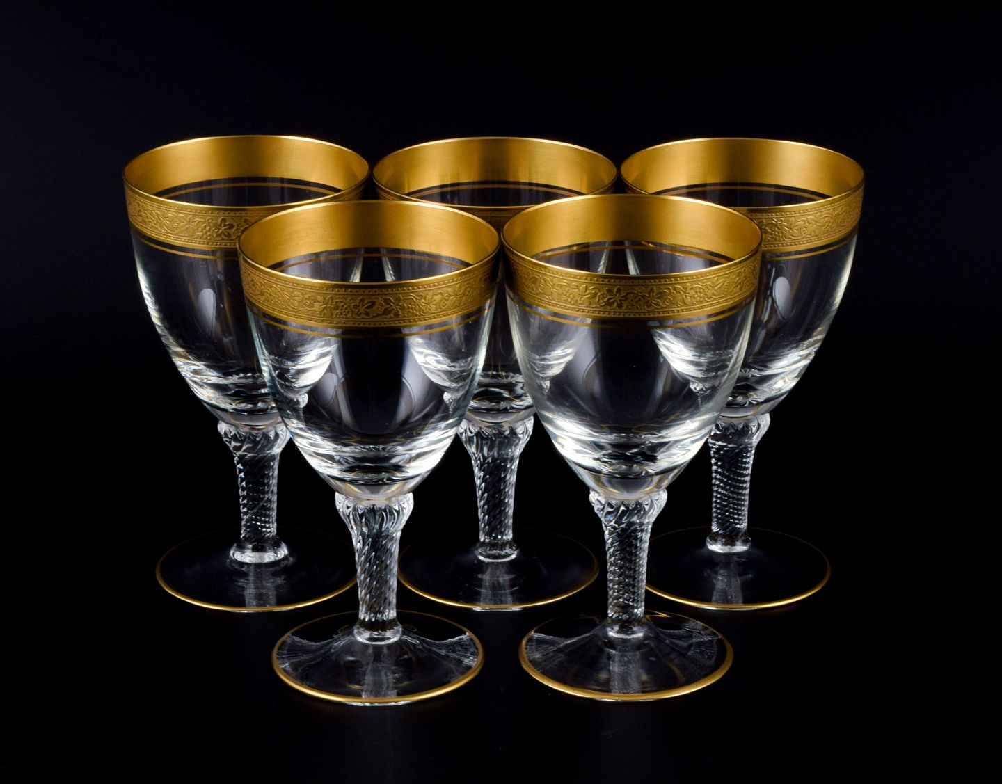 Rimpler Kristall, Zwiesel, Germany, five hand blown crystal red wine glasses with gold rim decorated with grapes and vine leaves. 1960s. In perfect condition. Dimensions: H 13.5 x D 7.5 cm.
