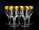 Rimpler Kristall, Zwiesel, Germany, five hand blown crystal white wine glasses with gold rim decorated with grapes and vine leaves.