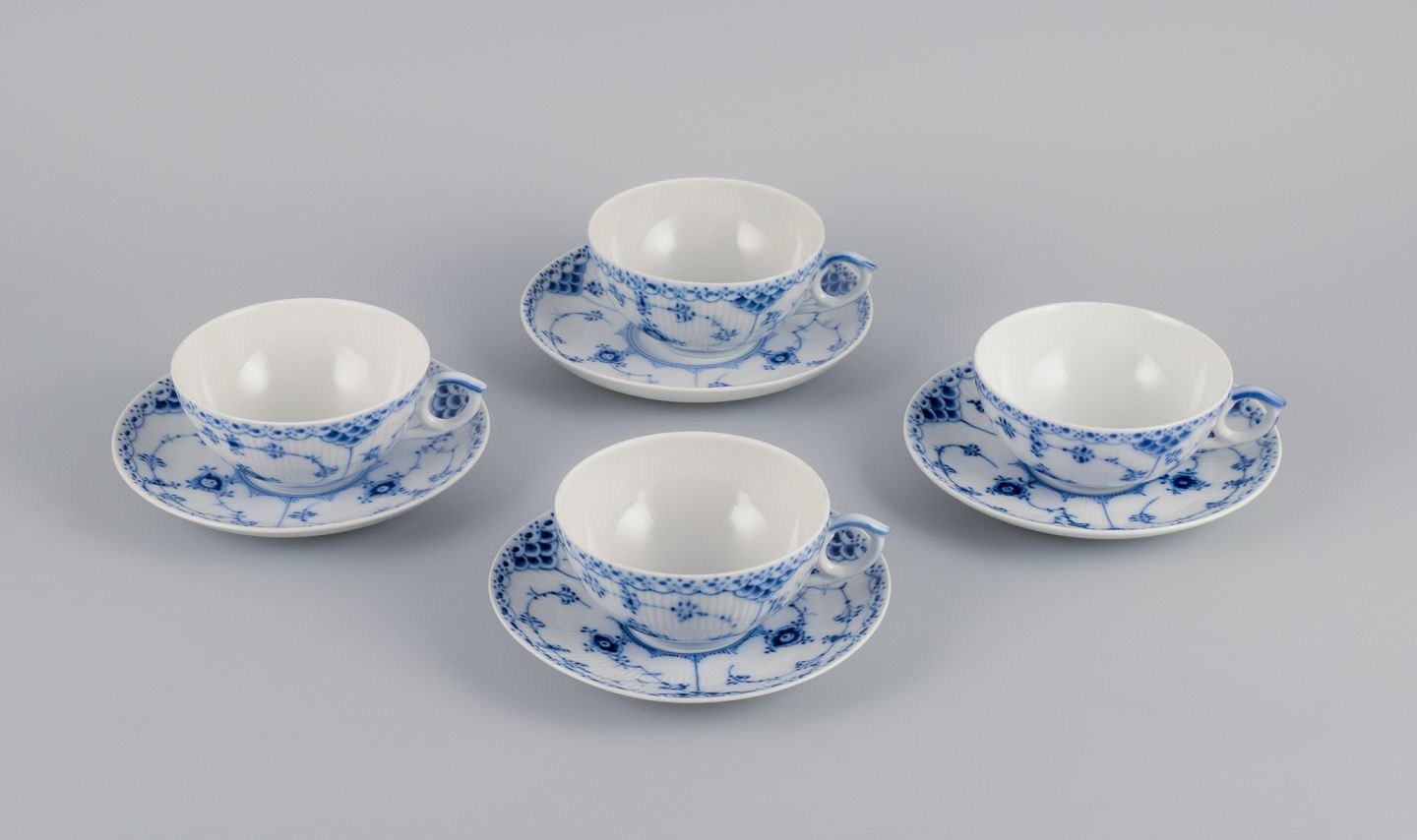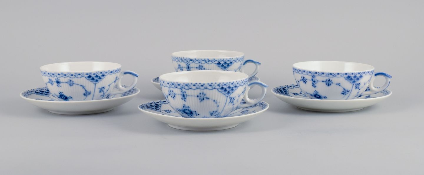 Royal Copenhagen, Blue Fluted half lace, four pairs of teacups. Model 1/525. Second and third factory quality. Marked. In perfect condition. Cup: D 9.8 x H 5.0 cm. Saucer: 14.5 cm.