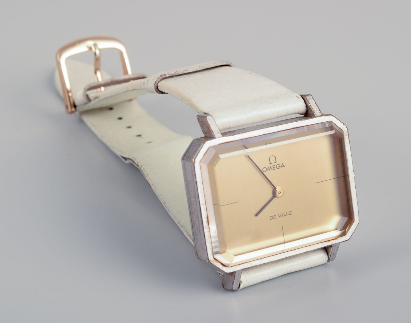Omega De Ville. Wristwatch with a white leather strap. Approximately 1980. In perfect condition. The watch is running. Dimensions: 32 mm.
