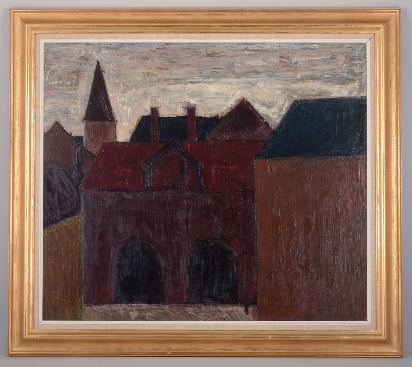 Peder Brøndum Sørensen (1931-2003), Danish painter, oil on board. "Dark Houses". 1964. Signed. In perfect condition. Dimensions: 74.0 cm x 64.0 cm. Total with frame: 89.5 cm x 79.5 cm.