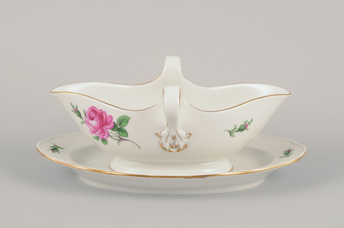 Meissen, Germany. Sauce boat on a stand with a motif of a pink rose. Gold rim.