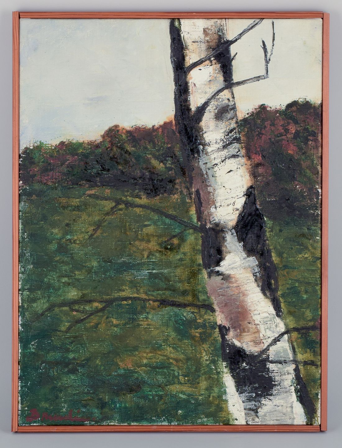 Hanna Brundin (1914-2000), Swedish artist. Oil on canvas. Landscape with birch tree in the foreground.
