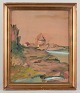 Landscape view from Bornholm with round church by the Baltic Sea.