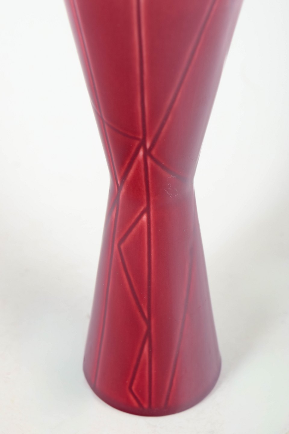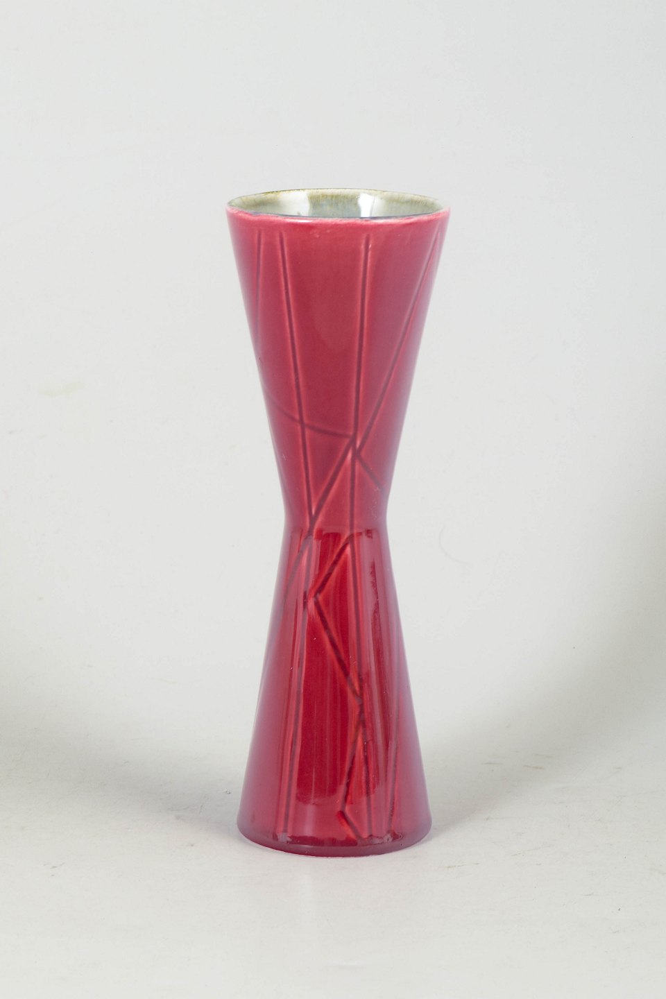 Slender hourglass-shaped vase in glazed stoneware with a deep red glaze and incised decoration. The model "California" is a characteristic example of Stålhane’s refined and disciplined ceramic design from the period.