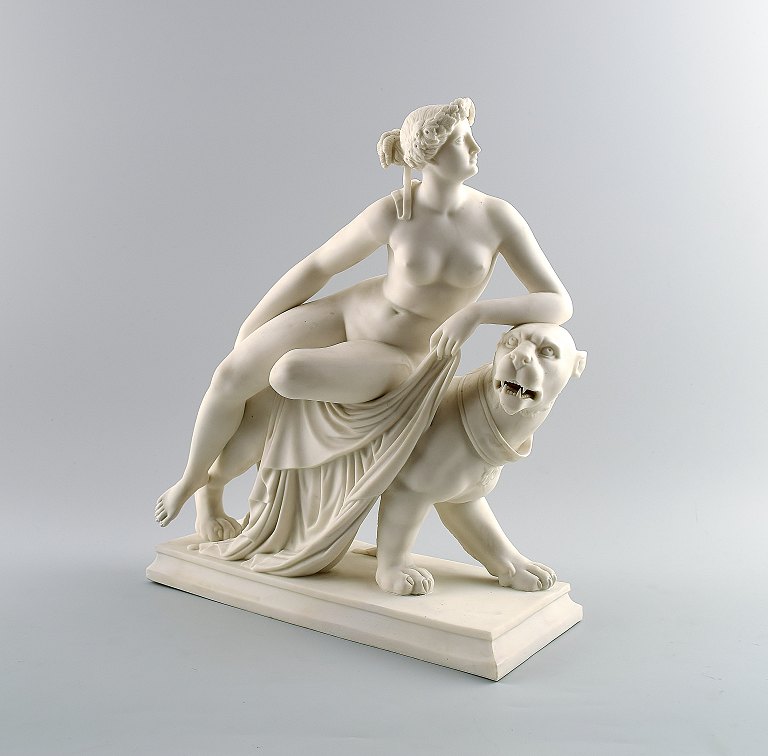 Klassisk skulptur af Ariadne på panter, biscuit på sokkel, Gustavsberg, sent 1800-tallet. Måler 31 cm. x 28 cm. I perfekt stand. Stemplet.