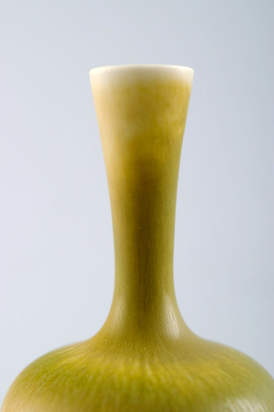 Berndt Friberg Studio keramikvase. Moderne svensk design. Unika, håndlavet. Fantastisk glasur i gulgrønne toner. Perfekt stand. 1. sortering. Måler: 7,5 cm. x 4,5 cm. Signeret.