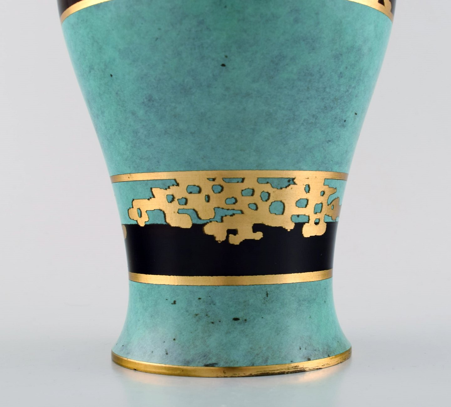 Art Deco vase, grønpatineret bronze med gulddekoration "Ikora" WMF (Württembergische METALLWARENFABRIK) I flot stand. Måler : 25,5 cm. x 14 cm. Stemplet.