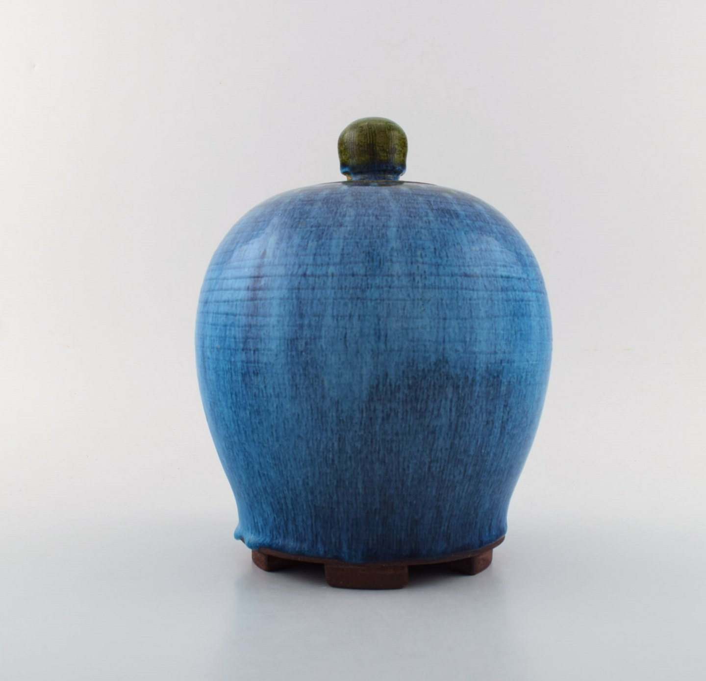 Stor unika Art deco lågkrukke på fødder af stentøj. Løbeglasur i turkis nuancer.