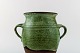 Gutte Eriksen: f. Rødby 1918, d. 2008. Stor unik vase af stentøj. modelleret med hanke, dekoreret med glasur i grønne nuancer. Måler : 25 x 24 cm. Signeret. I flot stand.