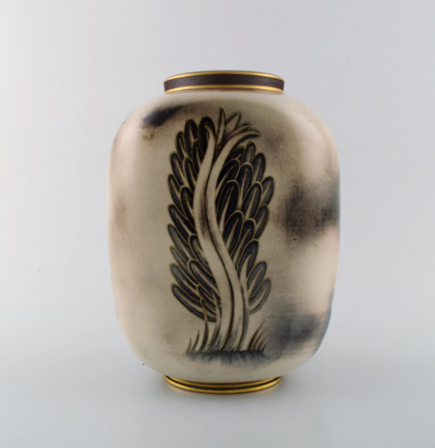 Gunnar Nylund for ALP Lidköping. Unique hand crafted Art Deco Flambé vase in ceramic with nude woman carrying jar. 1930's.