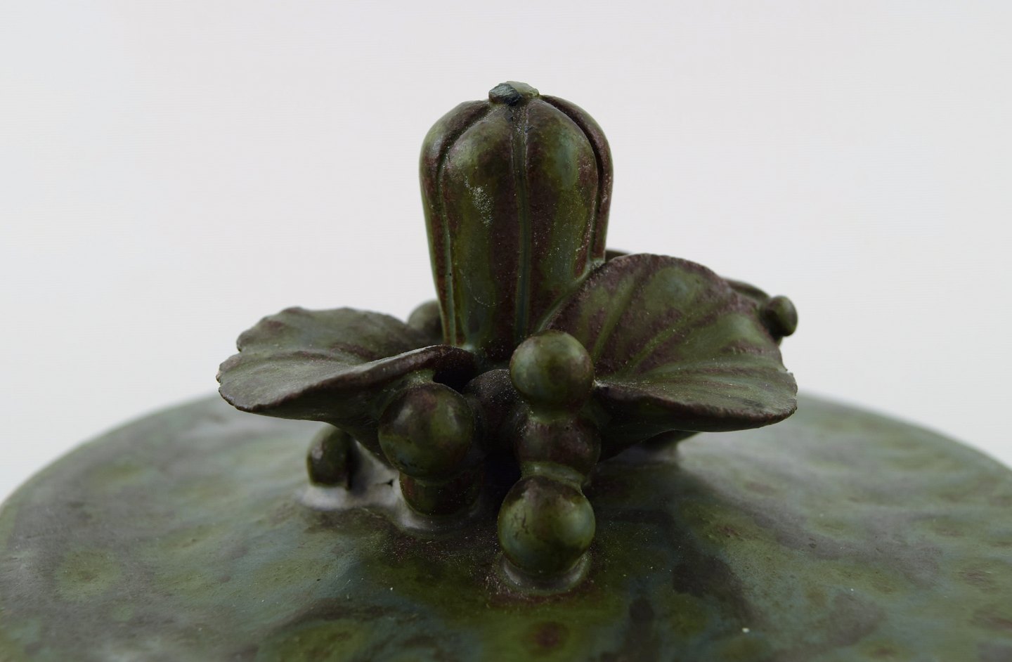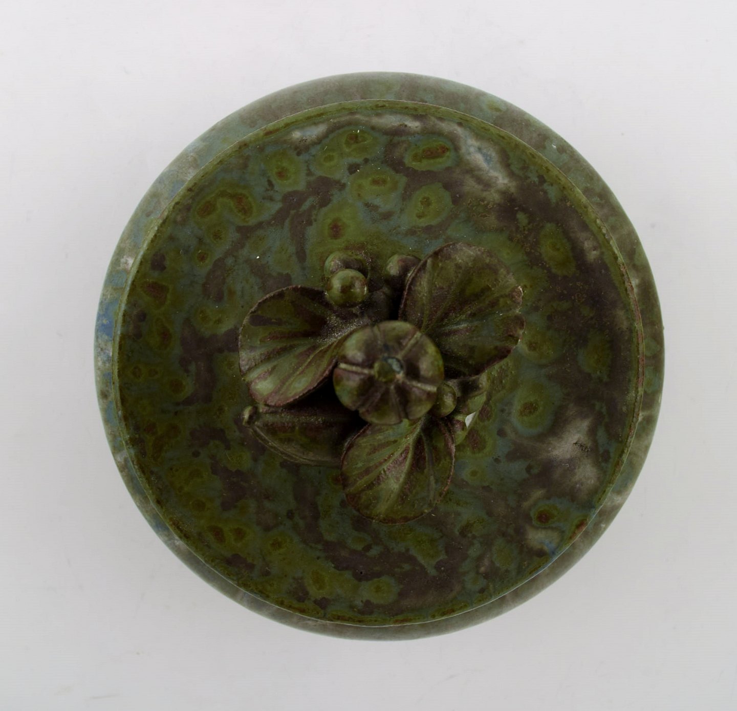 Arne Bang. Lågkrukke i glaseret keramik. Låg med bladværk. Smuk glasur i grønne nuancer. 1930'erne.