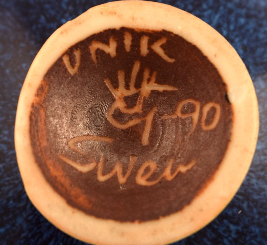 Sven Wejsfelt for Gustavsberg Studio Hand. Unika skål på fod i glaseret keramik. 1990. Smuk glasur i blå nuancer. Signeret. I flot stand. Måler: 5 x 2,5 cm.
